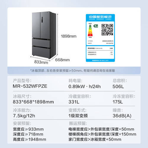 此款冰箱采用双变频技术和风冷无霜设计,提供高效的保鲜效果。其高能效设计,不仅节省电能,也为环保贡献一份力量。