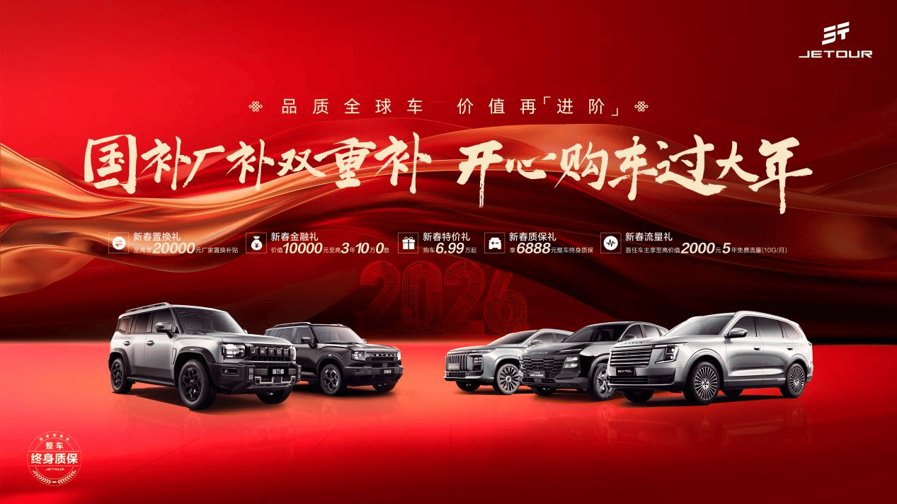 轿车在全球方盒子SUV范畴强势包围,凭仗硬核产品力与深沉品牌沉淀,完成国内海外商场双线领跑,成为我国品牌出海的实力标杆。值此2026新年开篇之际,连续全球热销热潮,捷途轿车暖心发动“国补厂补两层补,高兴购车过大年”新春促销活动,以多重诚心权益,让更多用户轻松具有统筹自在探究与质量家用的出行同伴,敞开多彩游览日子。
